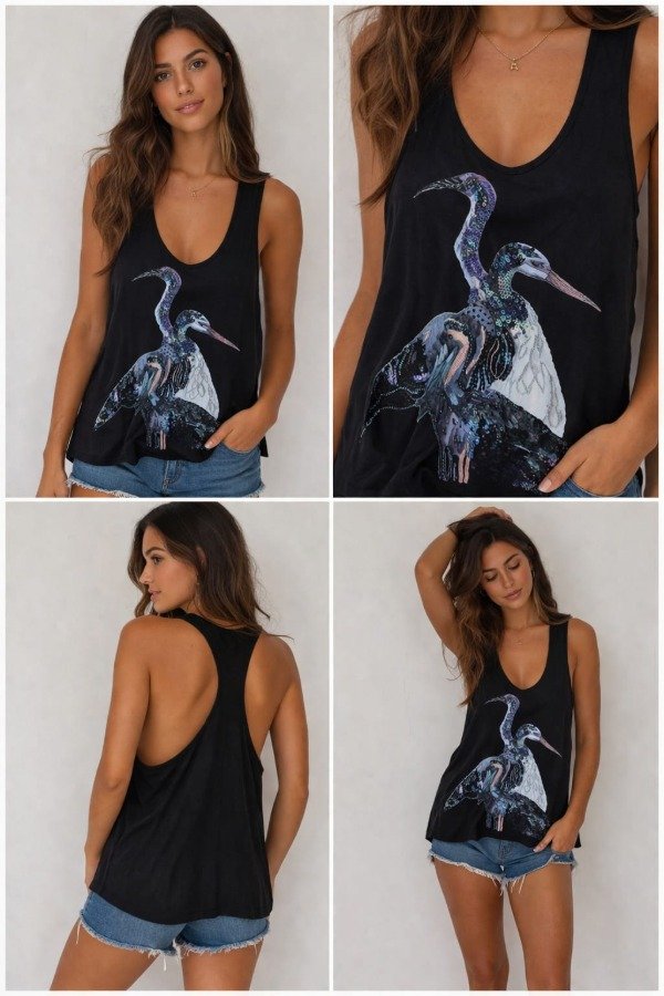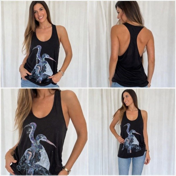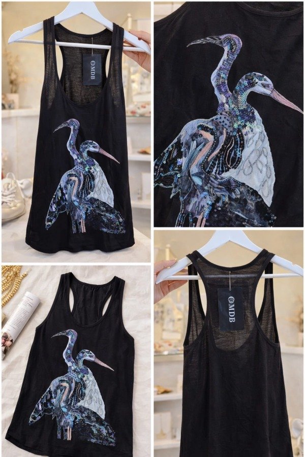 Musculosa negra calada de espalda nadadora con garzas bordadas en lentejuelas tornasoladas al frente. Caída larga y silueta holgada. Para looks cancheros de noche. Material: viscosa liviana con bordado de lentejuelas.